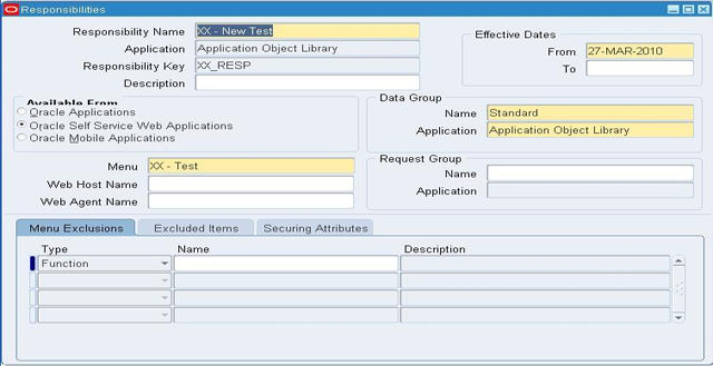 BEGIN fnd_user_pkg.addresp ( username => lc_user_name, resp_app => lc_resp_appl_short_name, resp_key => lc_responsibility_key, security_group => lc_security_group_key, description => NULL, start_date => ld_resp_start_date, end_date => ld_resp_end_date ); COMMIT; EXCEPTION WHEN OTHERS THEN ROLLBACK; DBMS_OUTPUT.PUT_LINE(SQLERRM); END; / SHOW ERR;