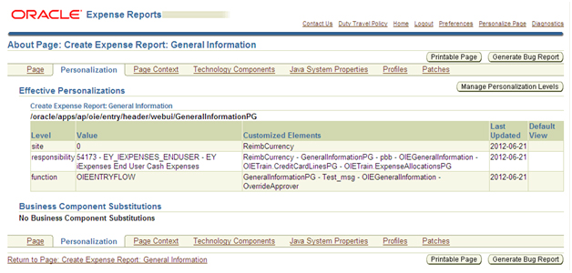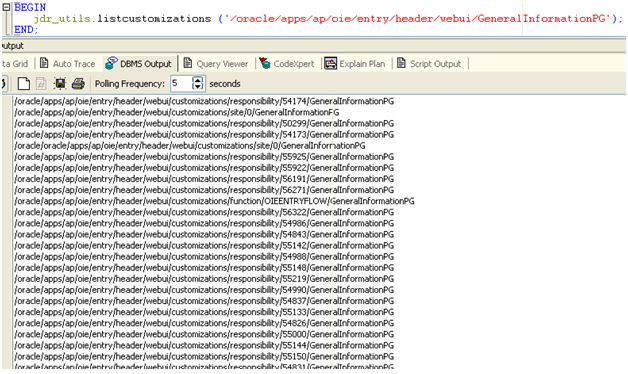 jdr_utils.listcustomizations(p_document => '/oracle/apps/ap/oie/test/webui/HomePG');