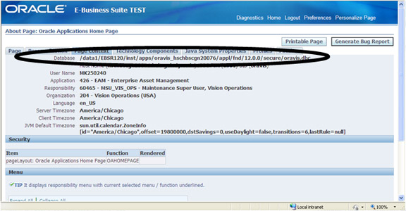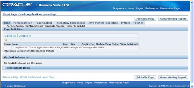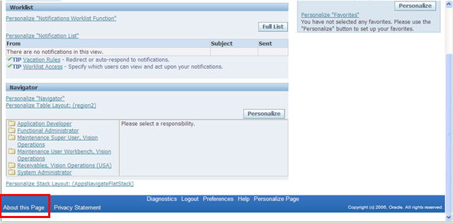 Set the FND: Diagnostics Profile Option as “YES” to see About this Page link